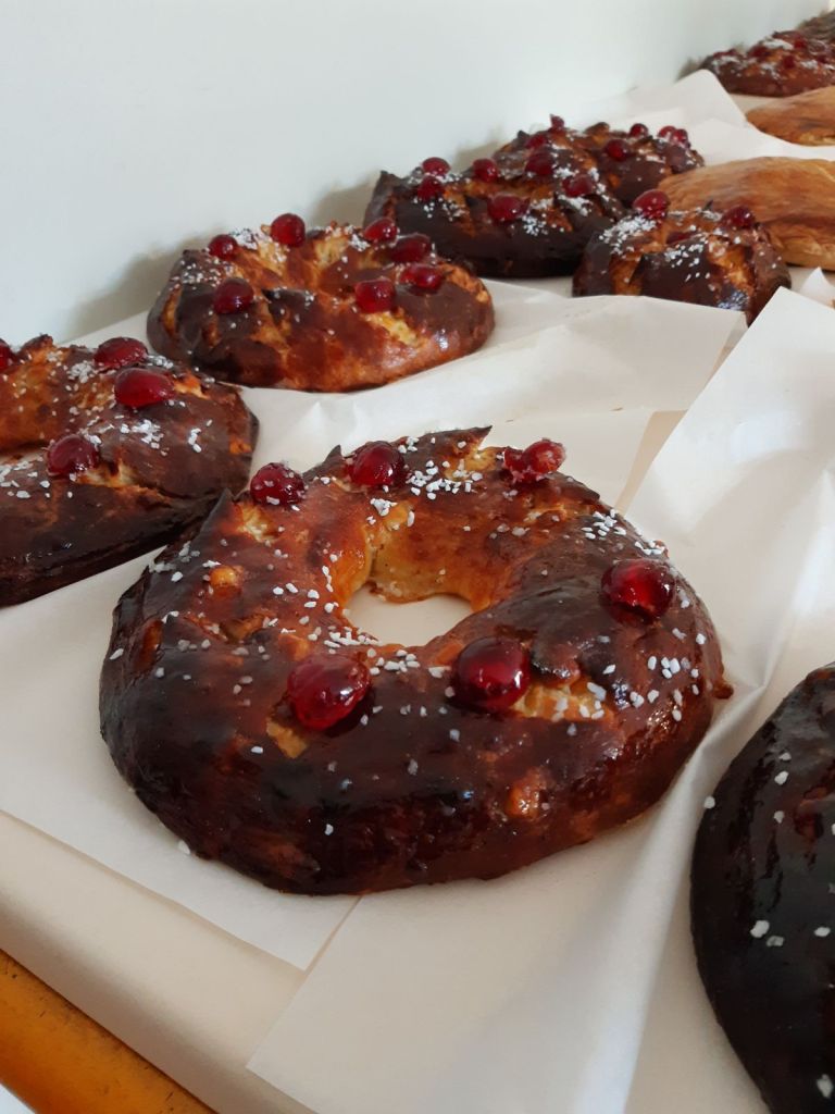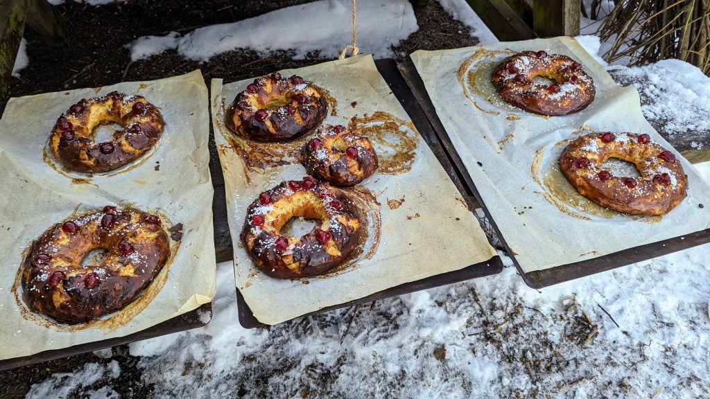Une deuxième, puis une troisième fournées sont cuites, avec un succès plus mitigé dû à une seconde chauffe plus forte que la première, mais le résultat est tout de même satisfaisant même si l’aspect est un peu plus bronzé. Les galettes et les couronnes sont glacées au sirop et les couronnes décorées de sucre et de cerises confites.