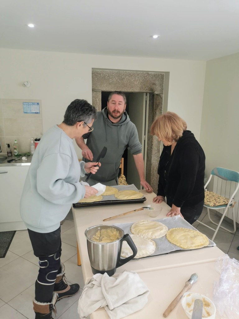 Mercredi 10 janvier : Les volontaires se retrouvent autour du chef boulanger pour les premiers préparatifs dans le local des associations : pesées des ingrédients et préparation de la pâte. Les pâtons sont mis au repos au froid. Pendant ce temps, nous préparons la crème d’amande qui servira de base à la frangipane. La crème est mise au repos au frais.