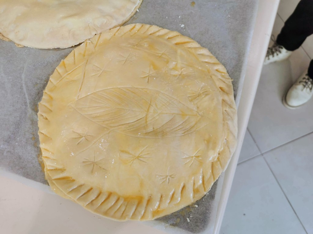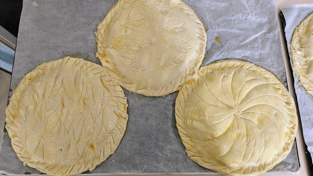 Pendant la pousse, nous reprenons nos abaisses pour les garnir de frangipane à la poche à douille avant de les recouvrir, de les dorer et de les inciser. Les décors incisés n’auront malheureusement pas tous la visibilité voulue au final, nous ferons mieux la prochaine fois.