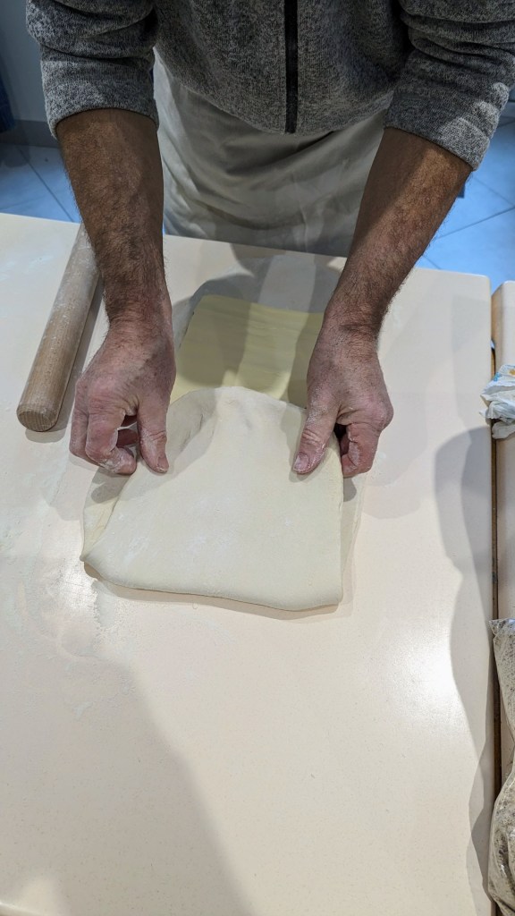 Commence alors le travail de feuilletage. Les blocs de pâte fourrée au beurre sont étirés au rouleau, repliés en trois, tournés et étirés de nouveau puis repliés et remis au froid pour éviter que le beurre ne se mélange à la pâte. L’opération sera répétée pour réaliser cinq tours, puis la pâte réservée au froid.