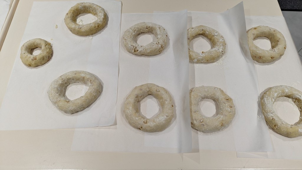 Une fois toutes les galettes montées et mises au repos au frais. Après une pause repas bien méritée, les opérations reprennent avec le façonnage des couronnes. La pâte, qui a poussé, est reprise, pesée par pâtons et formée en couronnes, puis dorée et mise à reposer à température ambiante.