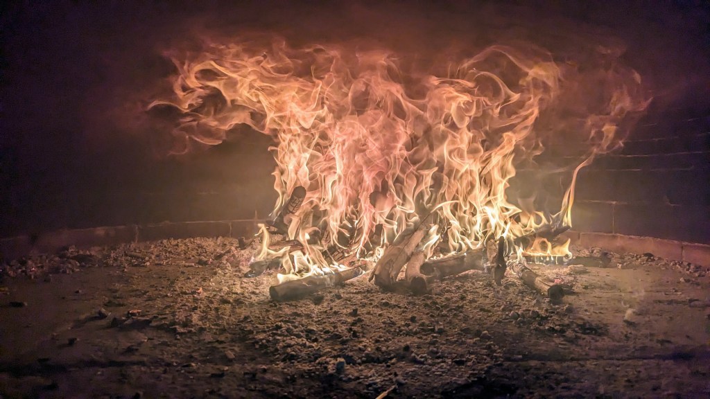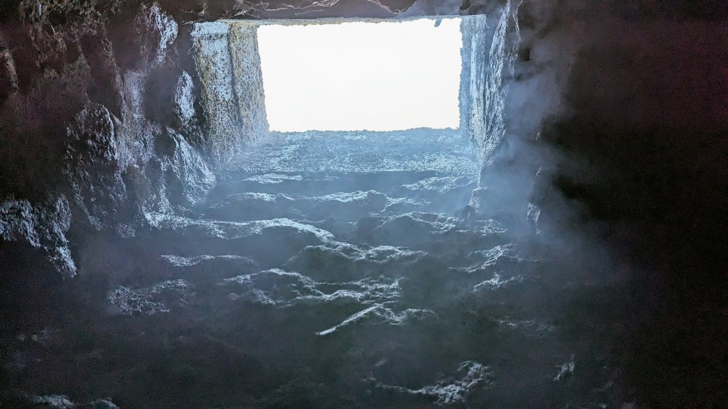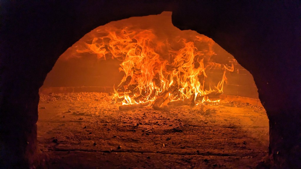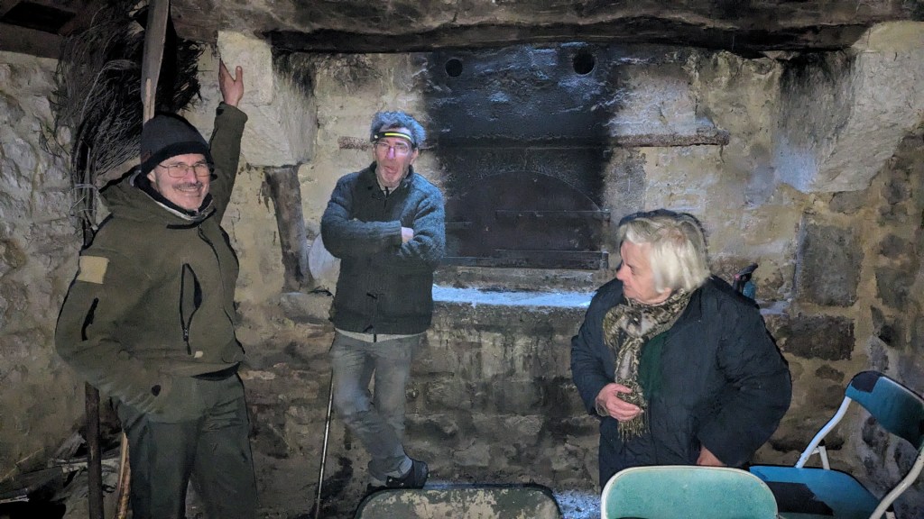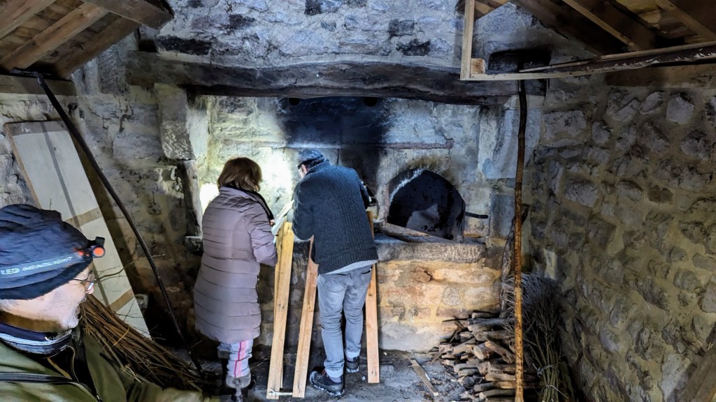Une fois la première fournée sortie, il faut relancer la chauffe car le four avait trop refroidi. Nous mettons ce temps à profit pour nous sustenter un peu et lutter contre le froid mordant.