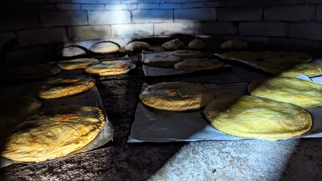 Vendredi 12 janvier : Les grandes manœuvres : il faut maintenant monter couronnes et galettes jusqu’au four de Fermus pour la cuisson. Ce n’est pas une mince affaire car tout doit voyager à plat et sans se chevaucher. La montée se fait à trois voitures et à très faible vitesse pour éviter les mauvaises surprises. Finalement tout arrive sans encombre à destination.