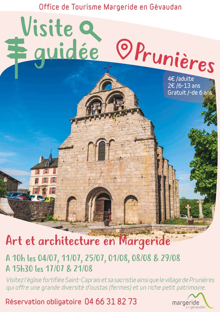 Visitez l’église fortifiée Saint-Caprais et sa sacristie ainsi que le village de Prunières. Marie-Hélène Astruc vous guidera à travers l’histoire avec une promenade dans le village, l’église et un grand panel de façades de différents types d’Oustas ! Une visite inoubliable aux côtés d’une guide passionnée !